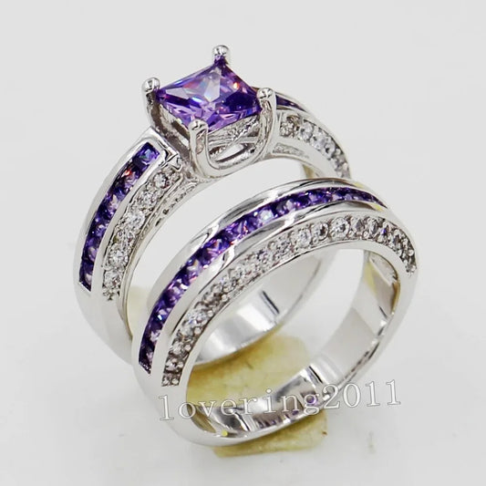 10KT White Gold Amethyst Promise Ring Set for Couples Wedding Bands