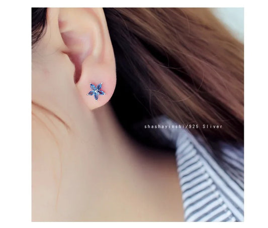 Women’s Small Flower Stud Earrings Blue Zircon 925 Silver Gold