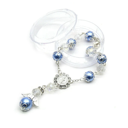 Angel Baptism Beads Imitation Pearl Crystal Rosary Bracelet With Box Saint Benedict Religious Jewelry White Blue