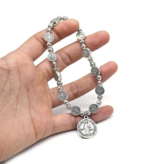 Catholic Vintage Metal Saint Benedict Pendant Bracelets Elastic Religious Rosaries