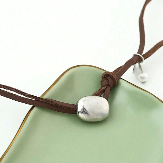 Retro Round Boho Leather Rope Pearl Necklace Brown Silver