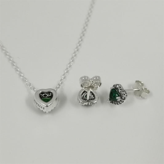 Pandora Green Sparkling Heart Halo Stud Earrings & Pendant Necklace Set – 45cm