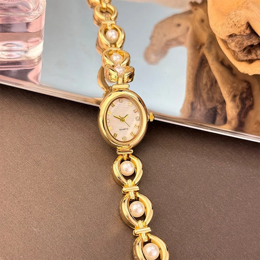 Elegant Oval Vintage Ladies Quartz Watch with Shell Bead Bracelet Luxury Minimalist Design
