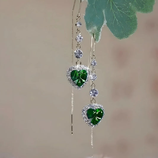 Green Zircon Heart Drop Earrings Women Long Tassel Jewelry