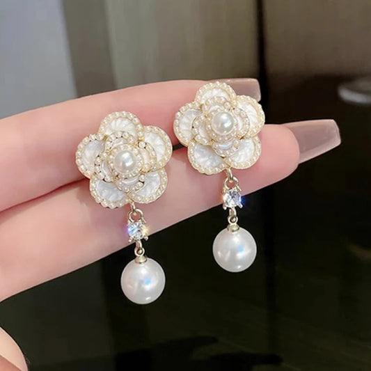 Elegant White Petal Flower Drop Earrings Women Kpop Bridal Jewelry