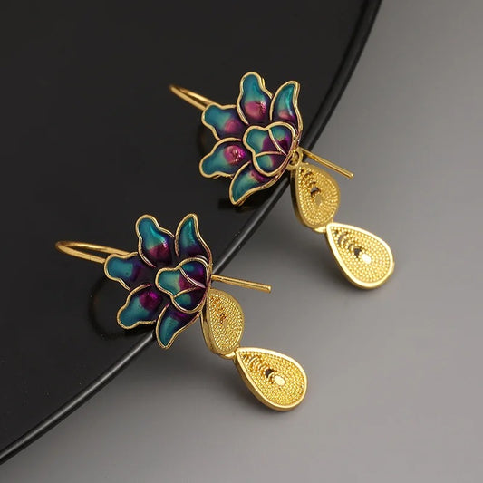 Blue Lotus Flower Drop Earrings for Women Gold Teardrop Statement Jewelry Gift