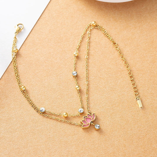 Multi layer zirconia stainless steel chain white pink lotus pendant women's fashionable jewelry gift summer beach ankle chain