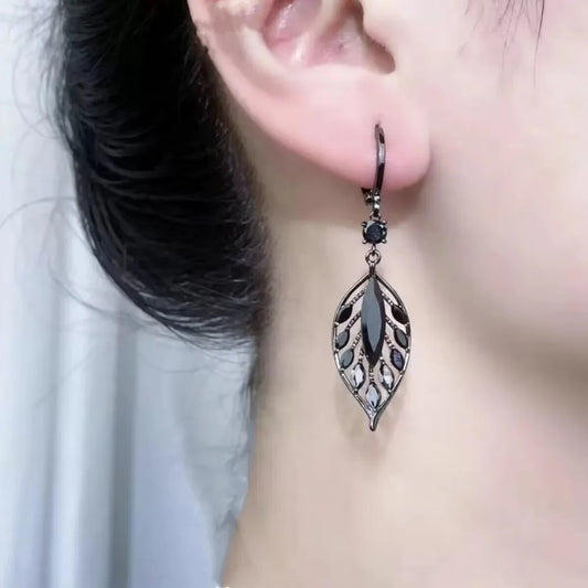 Retro Black Hollow Crystal Leaf Drop Earrings Korean Dangle Jewelry