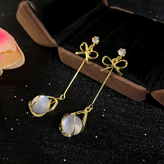 Round Opal Bead Dangle Earrings Women Bow Knot Rhinestone Jewelry