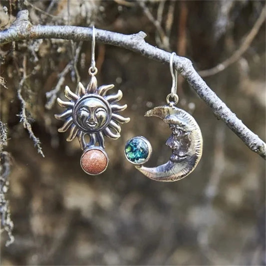 Vintage Sun Moon Earrings Silver Color Red Blue Stone Dangle