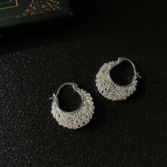 Women’s Silver Color Hoop Earrings Manual Carved Beads Loop Jewelry