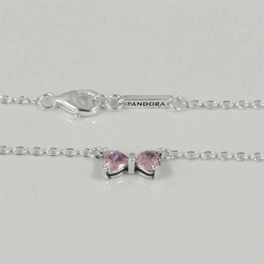 Authentic Pandora Sparkling Pink Bow Necklace – 45cm Sterling Silver Chain