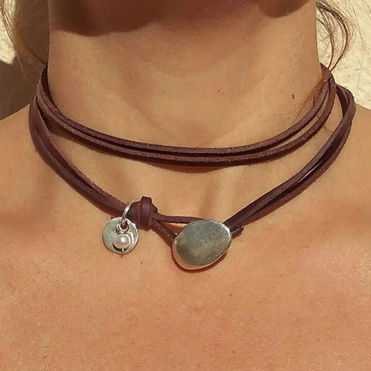 Retro Round Leather Rope Pearl Necklace for Women Brown Silver Jewelry