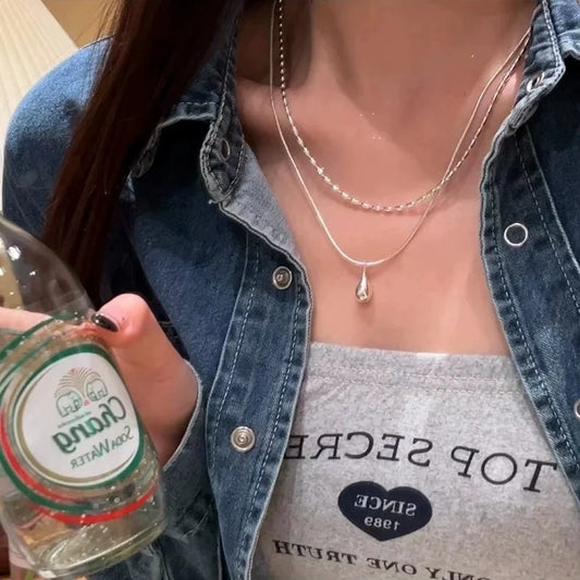 Charm Double Layer Water Drop Pendant Necklace Jewelry for Women Cute Cool Silver Color Clavicle Chain Jewelry