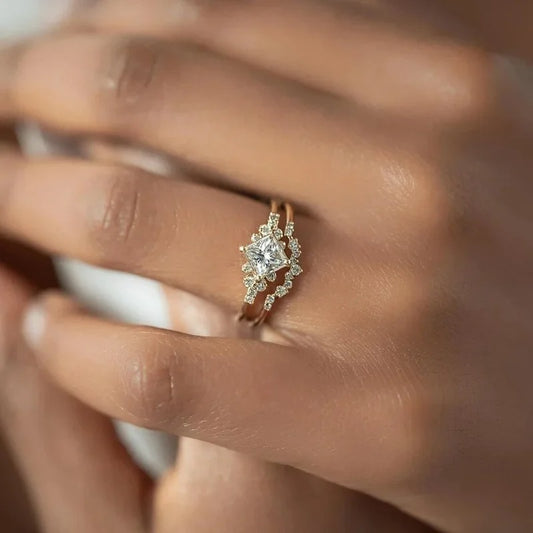 2pcs/set Fashion Metal Gold Plated Artisan Carved Ring Set Boutique White Zircon Ladies Classic Engagement Wedding Ring