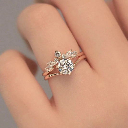 Ladies 2PCS Gold Plated Carved Ring Set Classic Zircon Jewelry