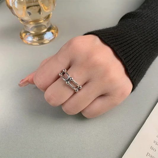 Korean Vintage Horseshoe Ring 925 Sterling Silver Adjustable U-Shaped Jewelry for Women