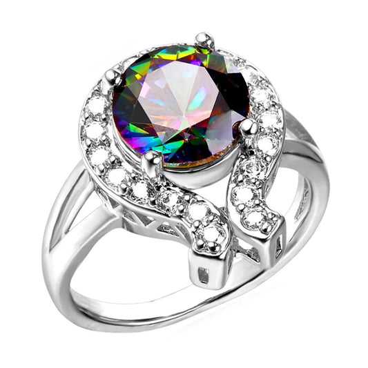 U7 White CZ Round Rainbow Topaz Gemstone Rings for Woman Size 6-10 Vintage Luxury Style Signet Ring Jewelry Gift for Her