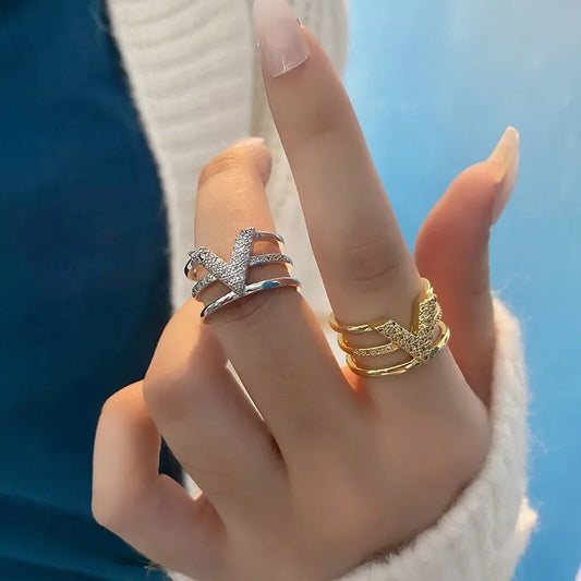 LIVVY V-Shaped Zircon Ring Three-Layer Adjustable Silver Jewelry