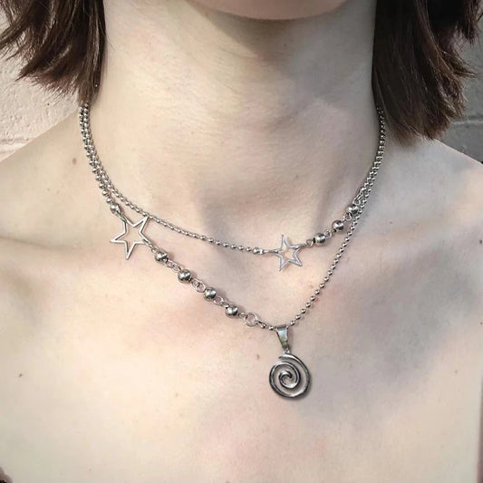 Stainless Steel Spiral Pendant Necklace, Layered Choker Star Charm Necklace, Grunge Y2K Cyber Fairycore Jewelry, Subversive Archive Alt Fashion Gift