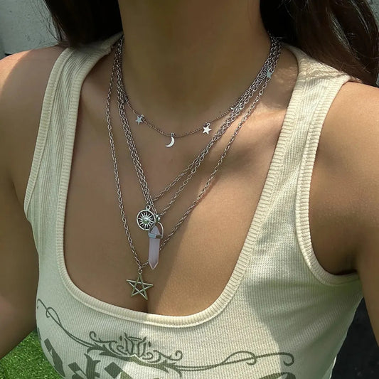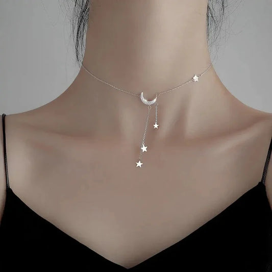Bling Silver Tassel Star Moon Necklace Women Birthday Jewelry