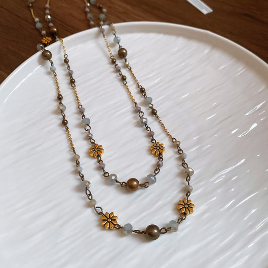 New Flower Glass Beaded Double Layered Stacking Chains Necklaces for Women Temperament Vintage Sweater High-end Fashion Jewelry