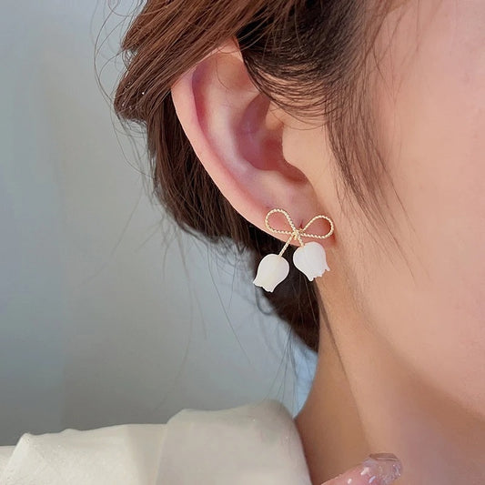 Elegant White Tulip Stud Earrings Women Gold Bowknot Party Jewelry