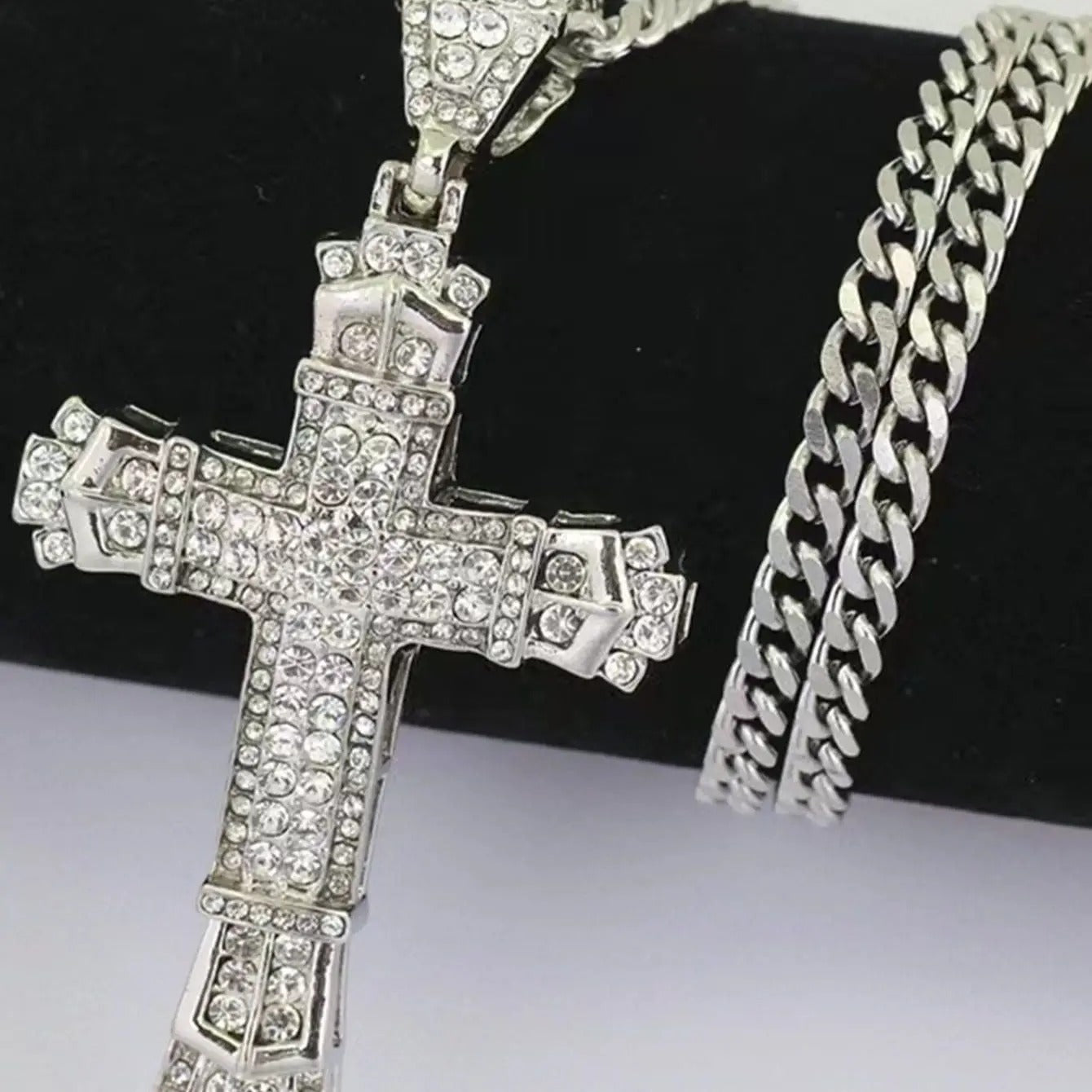 1 Simple Style MEN'S Rhinestone Christian Cross Rhinestone Pendant Necklace Personality Fashion Street Domineering Chain Jewelry