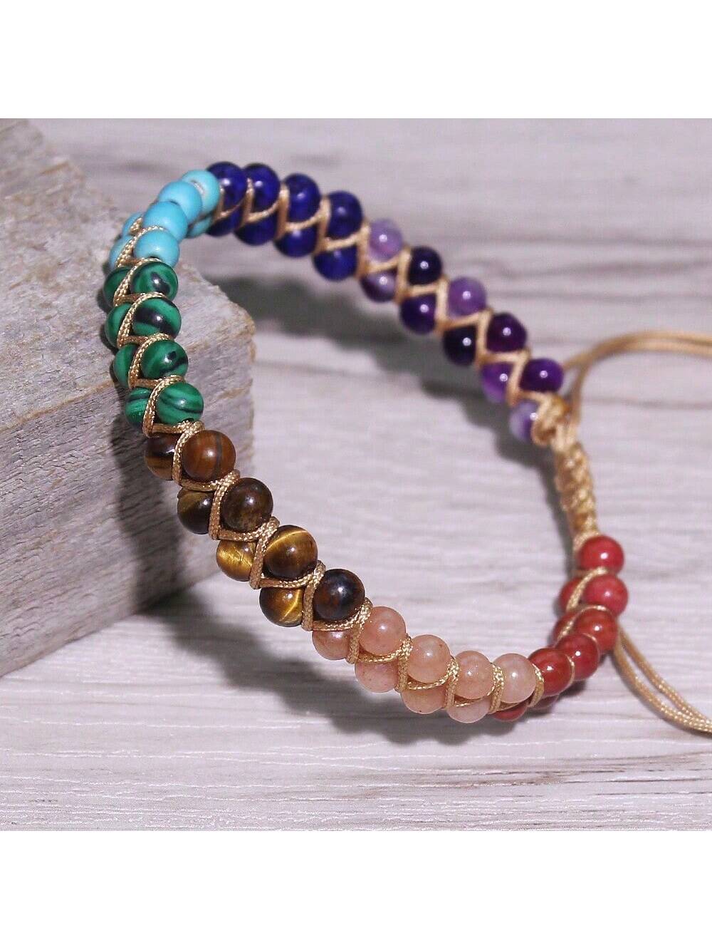 1pc Bohemian Style Handmade Natural Stone Chakra Anklet With 7 Stone And Adjustable Double Strands For Women