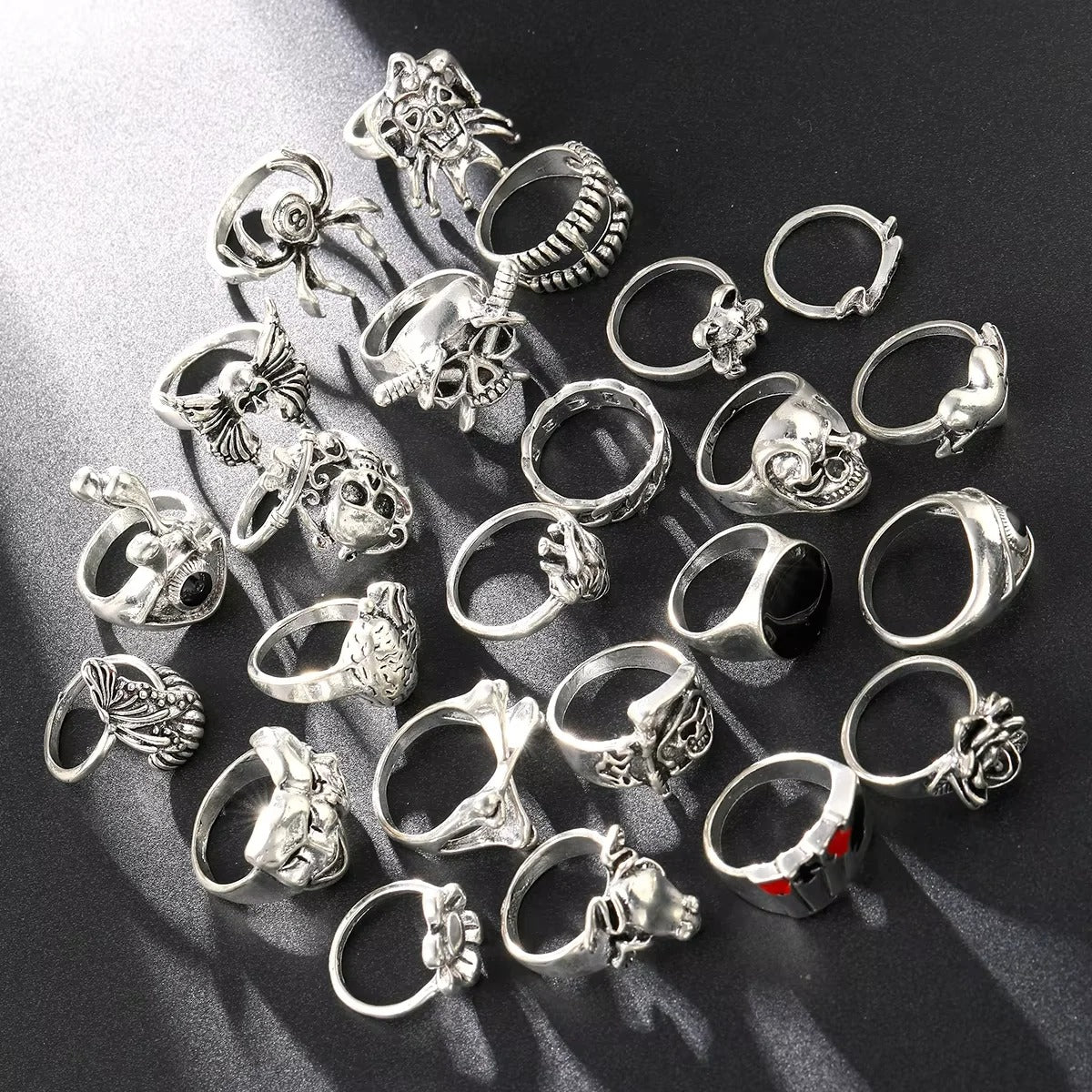 24Pcs/Set Punk Gothic Rings Sets Silver Color Skeleton Spider Poker Joker Eyes Heart Rings For Men Fashion Hip Hop Jewelry Gifts