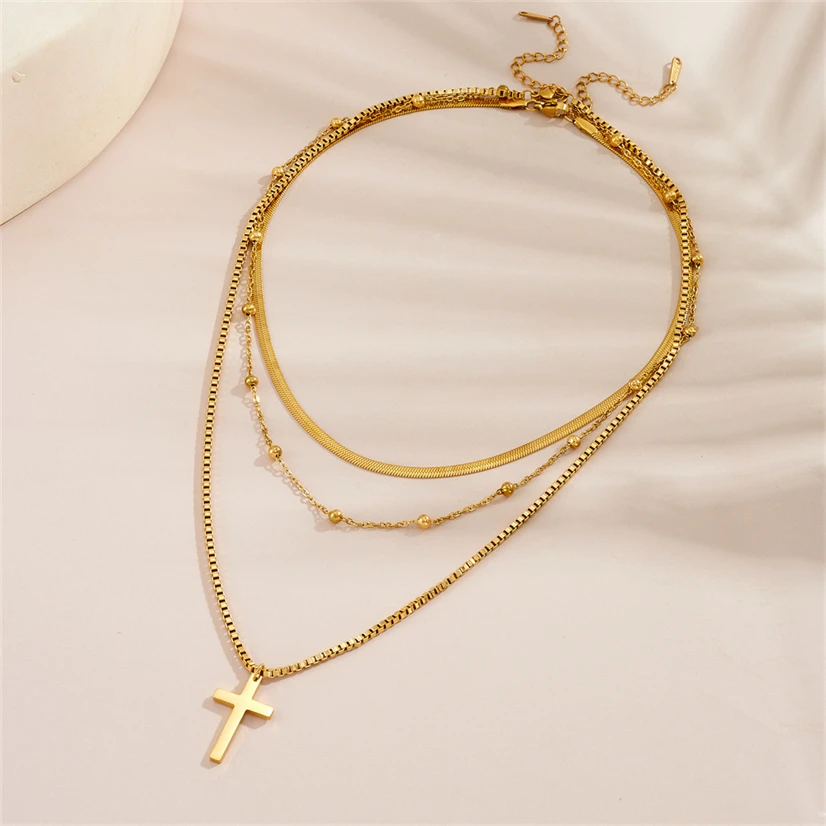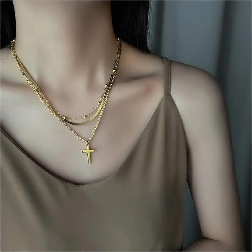 316L Stainless Steel New Fashion Upscale Jewelry 3 Layer Beaded Cross Charms Thick Chain Choker Necklaces & Pendants For Women