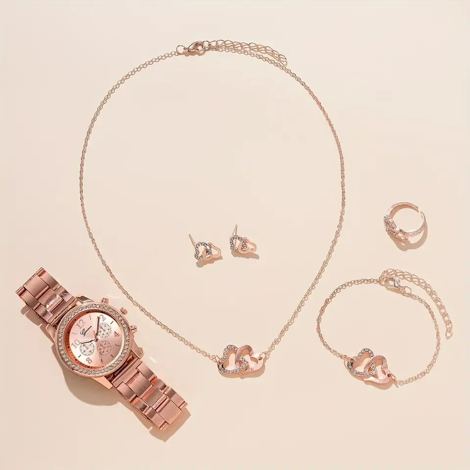 6PCS Set Rose Gold Luxury Watch Women Ring Necklace Earring Rhinestone Fashion Wristwatch Casual Ladies Bracelet Watches
