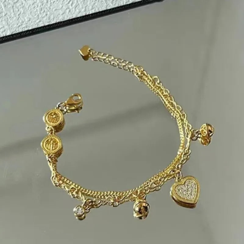 ANENJERY Gold Heart Zircon Bracelet Double Layer Charm Jewelry for Women