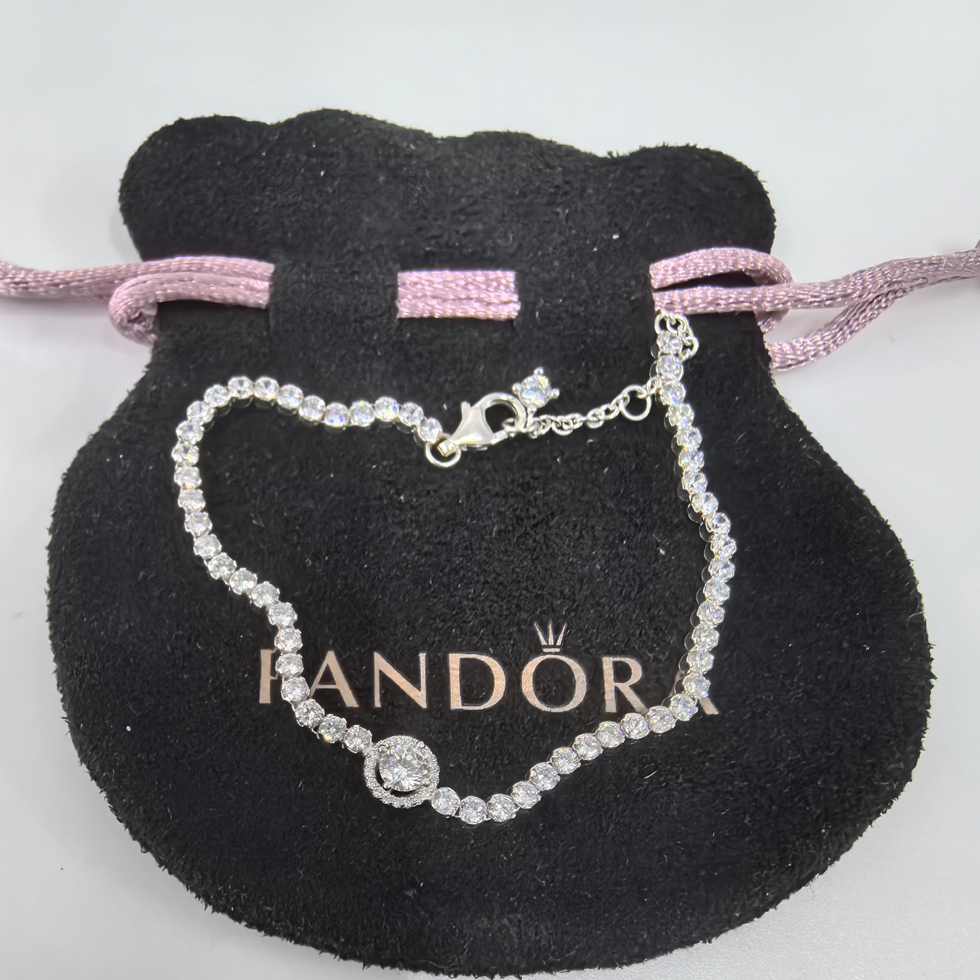 The Pandora Sparkling Halo Tennis Bracelet is crafted from genuine 925 sterling silver (S925 ALE), adorned with a series of brilliant-cut cubic zirconia stones for a luxurious finish. The centerpiece features a dazzling halo design, adding an extra touch of sparkle to this classic tennis bracelet style.