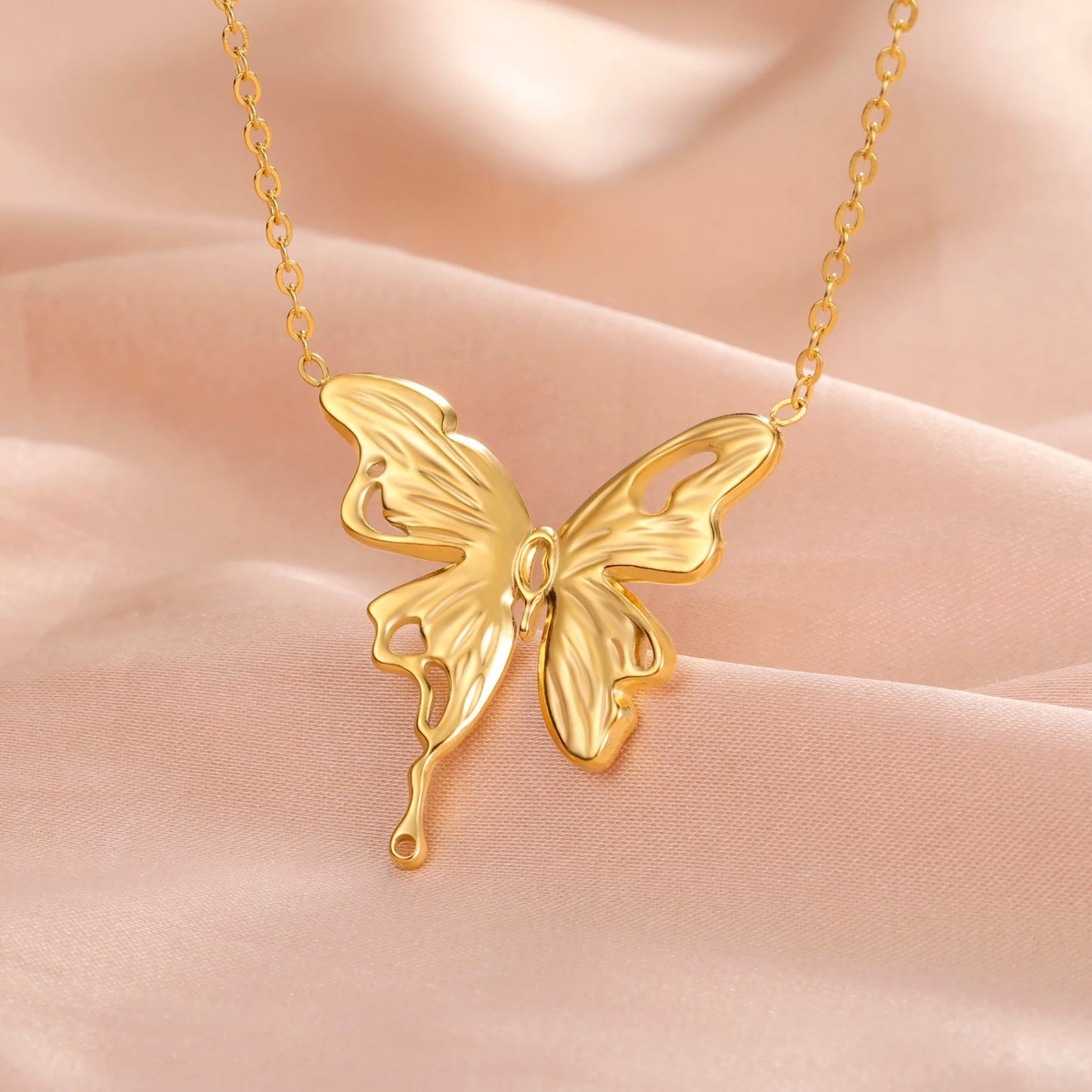 Elegant butterfly pendant necklace crafted from durable gold-colored stainless steel