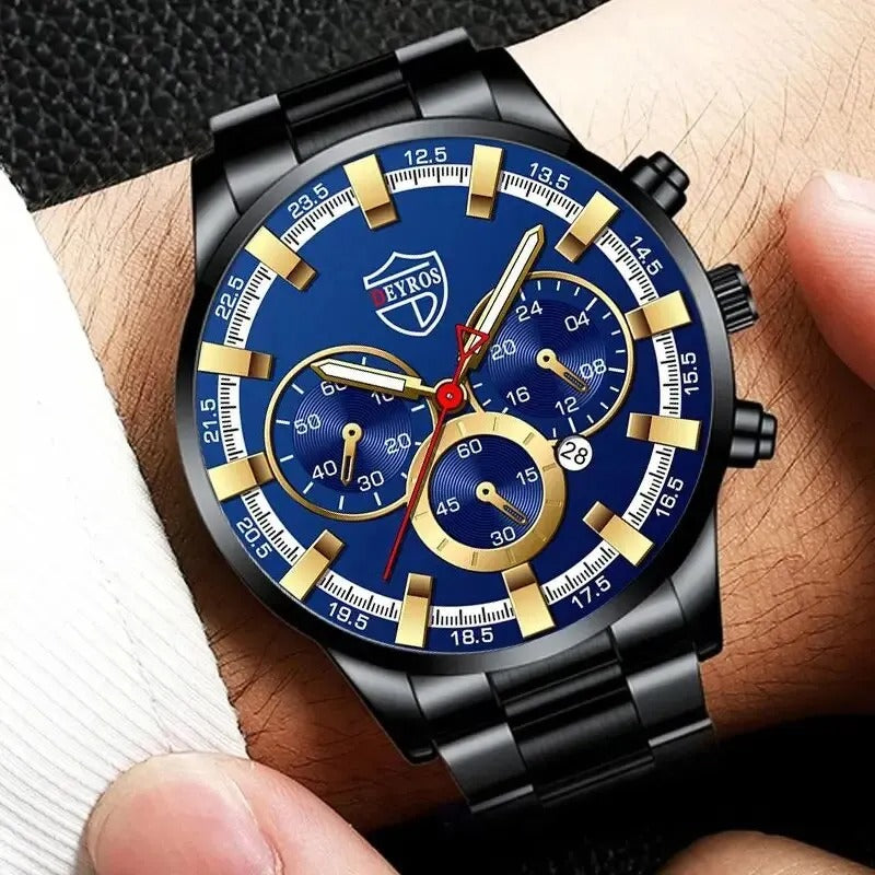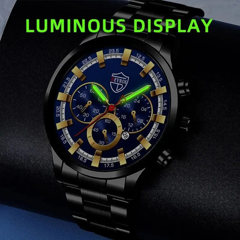 DEYROS 2pcs Luxury Black Quartz Watch With Stainless Steel Bracelet For Men Business Fashion Round Calendar Watch Set