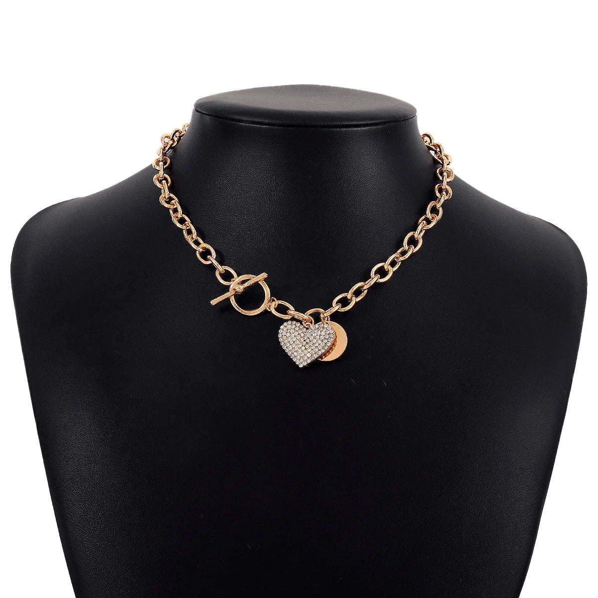 Exaggerated Full Crystal Heart Pendant Necklace For Women Fashion Gold Color Geometry Chain Necklaces Party Jewelry