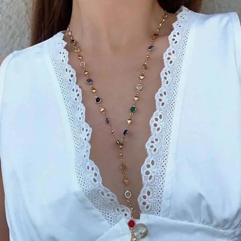 Add sparkle to your look with this fashionable colorful crystal chain necklace. Designed in a silver color with a Y-shaped long clavicle chain, it is simple yet eye-catching. Perfect for parties, birthdays, and everyday wear, this necklace makes a thoughtful jewelry gift for women who love vibrant style.