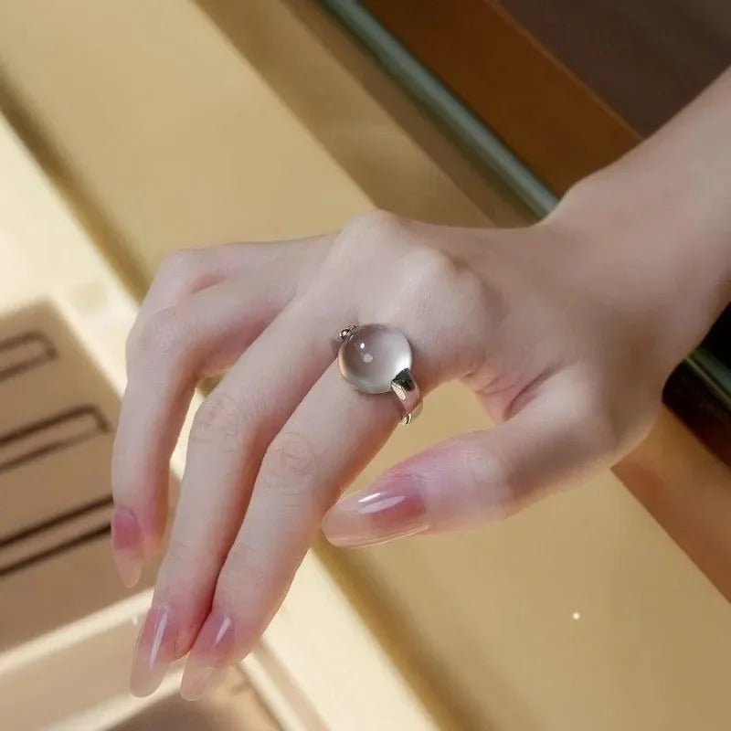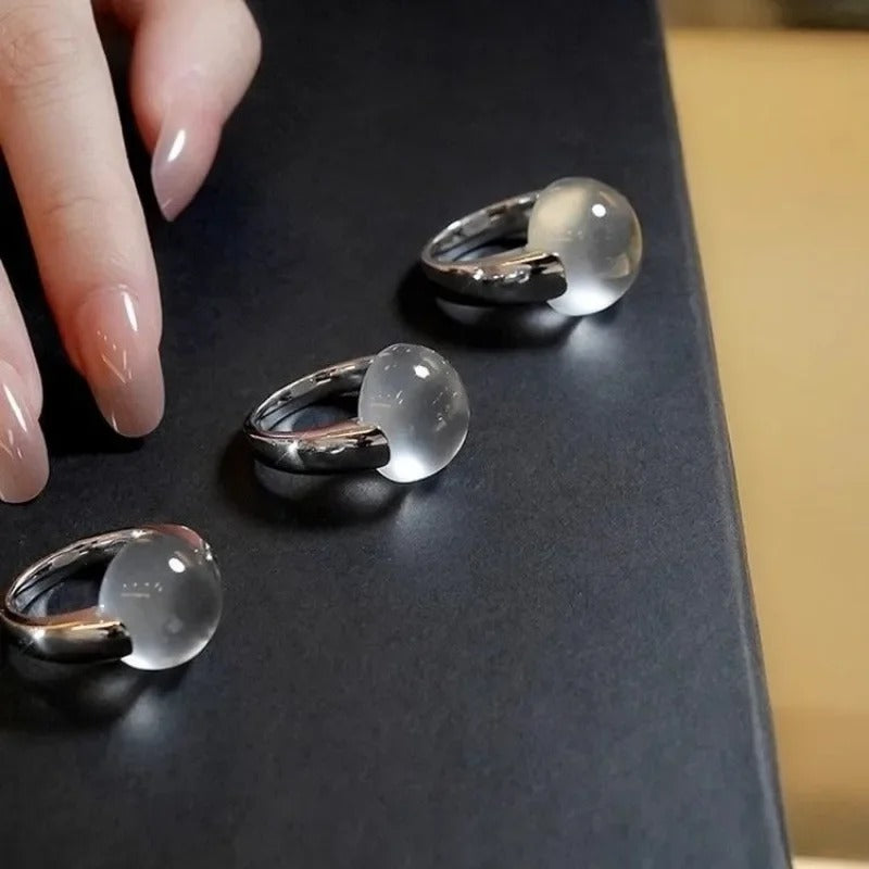 Gentle Style Glossy Natural Ice Chalcedony Rings for Women Translucent Light Luxury Round Bead Ring Minimalist Silver Jewelry