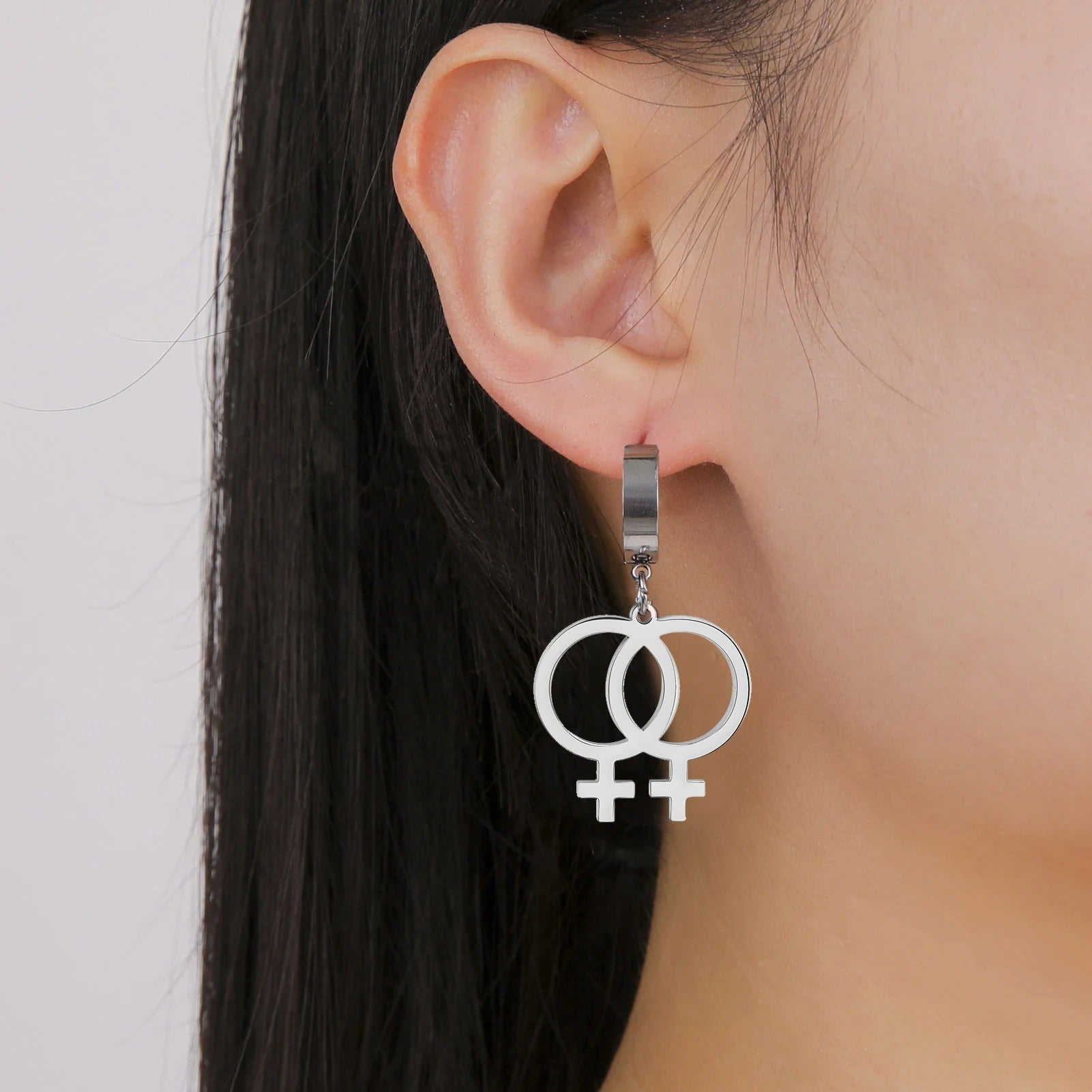 Stylish stainless steel dangle earrings featuring the female/lesbian love symbol