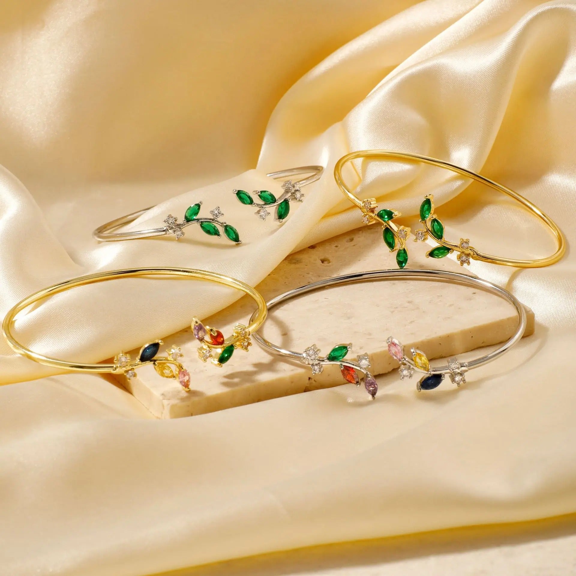 Elegant open cuff bracelet featuring a delicate leaf design with zircon accents