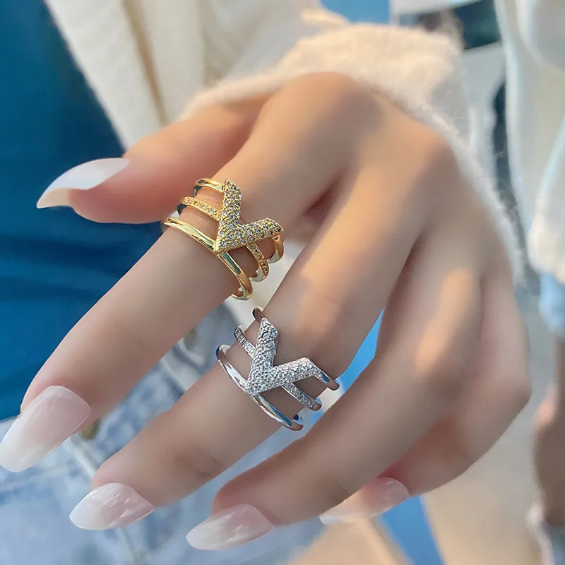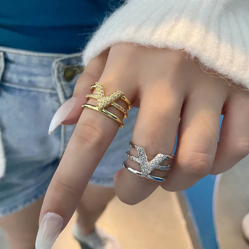 LIVVY Fashion Silver Color V-shape Three-layer Zircon Adjustable Rings For Woman Fashion High-end Trend Jewelry Accessories