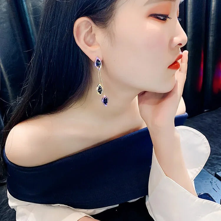 Long Tassel Leaf Drop Earrings for Women Purple Crystal Dangle Jewelry Gift