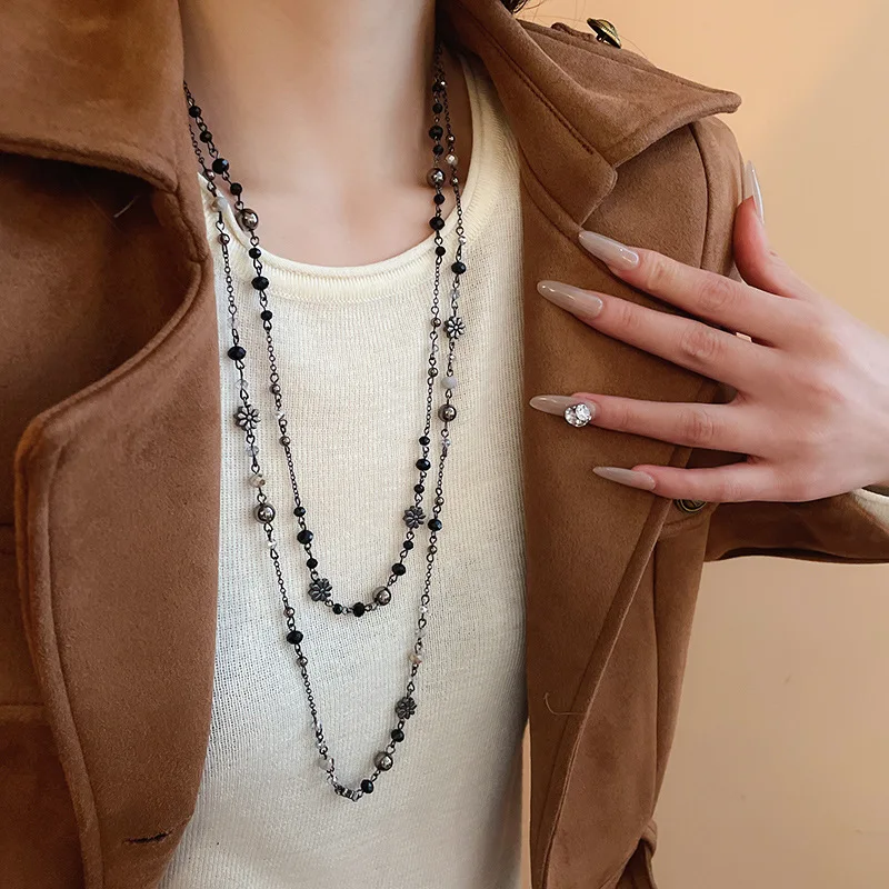 New Flower Glass Beaded Double Layered Stacking Chains Necklaces for Women Temperament Vintage Sweater High-end Fashion Jewelry
