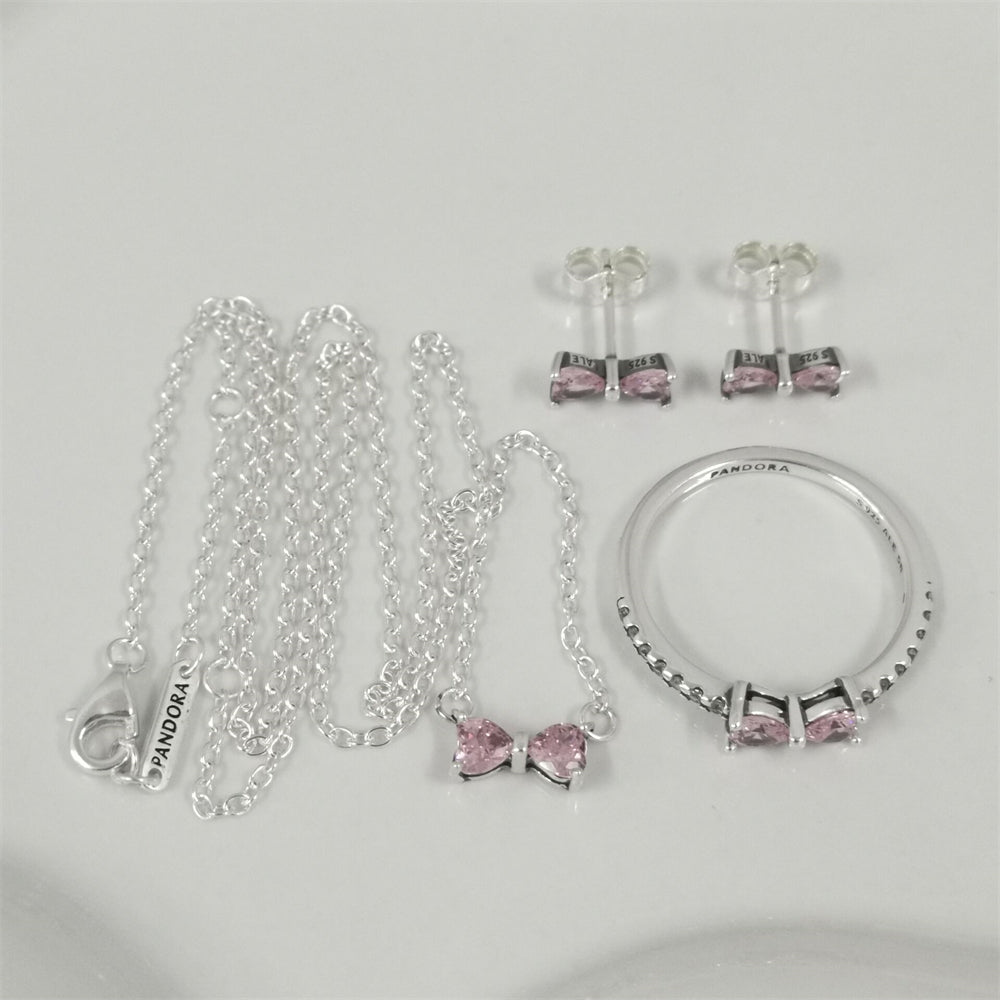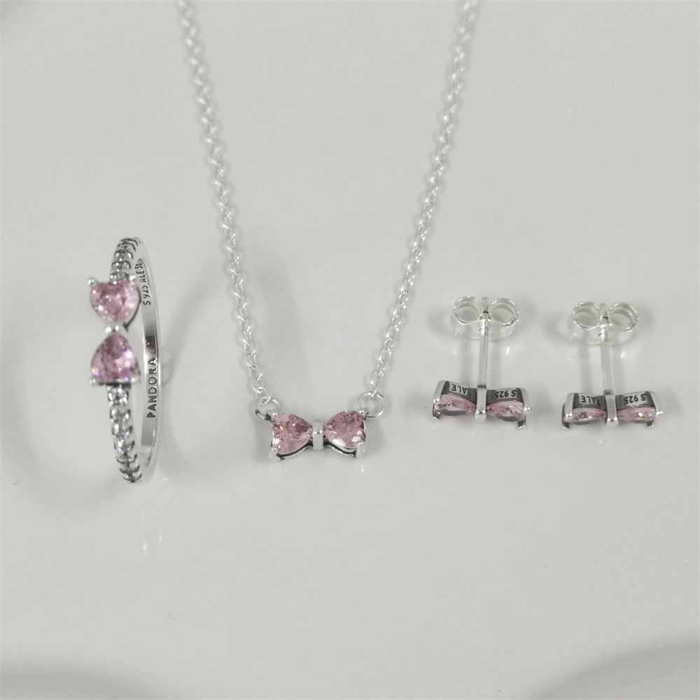 This stunning gift set includes a pink bow pendant necklace and matching stud earrings, both crafted from 925 sterling silver and accented with pink cubic zirconia for a soft, shimmering touch.