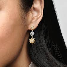 Shine karein har moment mein with Pandora ke dazzling Two-Tone Sparkling Triple Sun Drop Earrings.