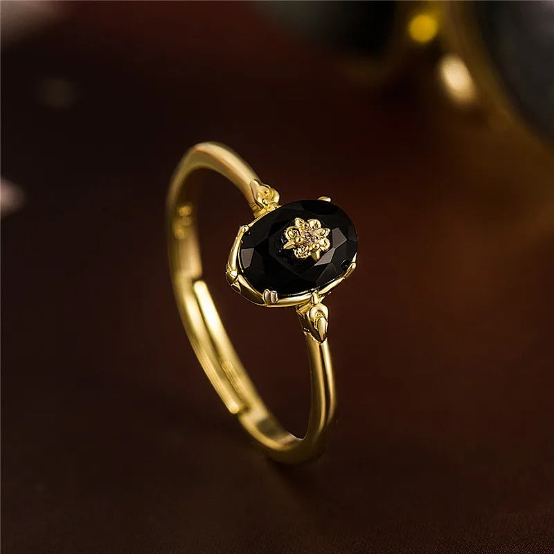 Real 925 Sterling Silver 18k Gold Plating Synthetic black agate Open Ring For Women vintage Light Luxury Fine Jewelry