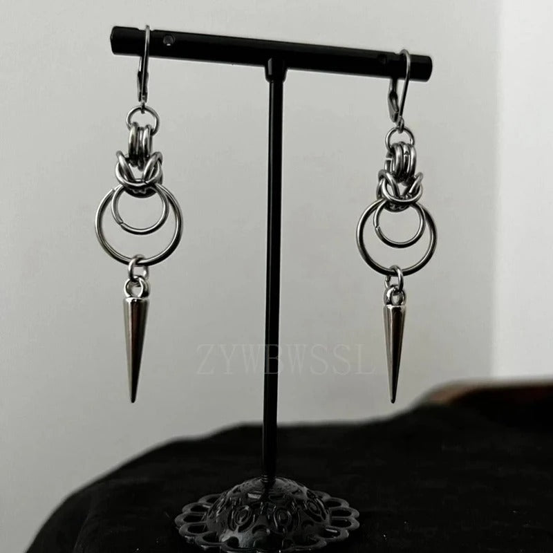 Unleash your bold style with these Stainless Steel Gothic Chainmail Double O Ring Spike Earrings. Designed for those who love edgy, alternative fashion, these huggie hoop earrings feature a unique chainmail-inspired double O-ring design with striking spike accents, making them the perfect statement piece for any gothic, punk, or rock-inspired look.