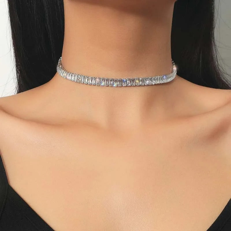 Stainless Steel Silver Color Zircon Choker Necklace for Women Exquisite Crystal Rectangle Geometric Necklace Wedding Jewelry