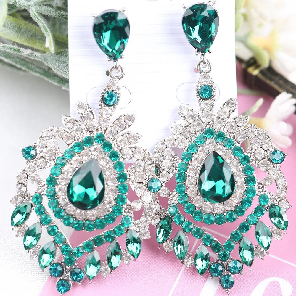 Vintage Statement Jewelry Wedding Long Green Emerald Crystal Rhinestone Chandelier Dangle Drop Earrings for Women